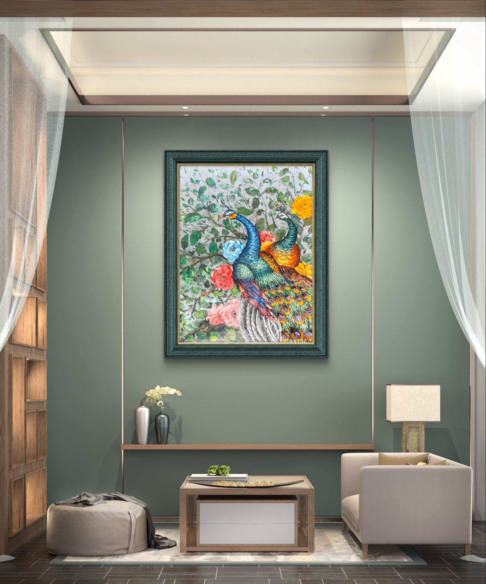 The Symphony of Feathers and Flowers is a beautiful harmony of nature. The pair of peacocks embodies grace, dignity, and steadfast love, while the gently surrounding blooms in a kaleidoscope of colors express a tapestry of emotions — love, joy, peace, and flourishing life. This scene reflects the balance of masculine and feminine energies, and the seamless union of outer beauty with inner spirit, celebrating, in truth, the exquisite elegance of nature.