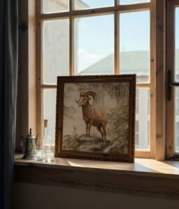 Goat Among the Bamboo captures the quiet dignity of a mountain ram standing proudly amidst misty bamboo groves. Its strong horns curve gracefully, symbolizing resilience and balance within nature. A portrait of strength in serenity — a timeless harmony between creature and landscape.