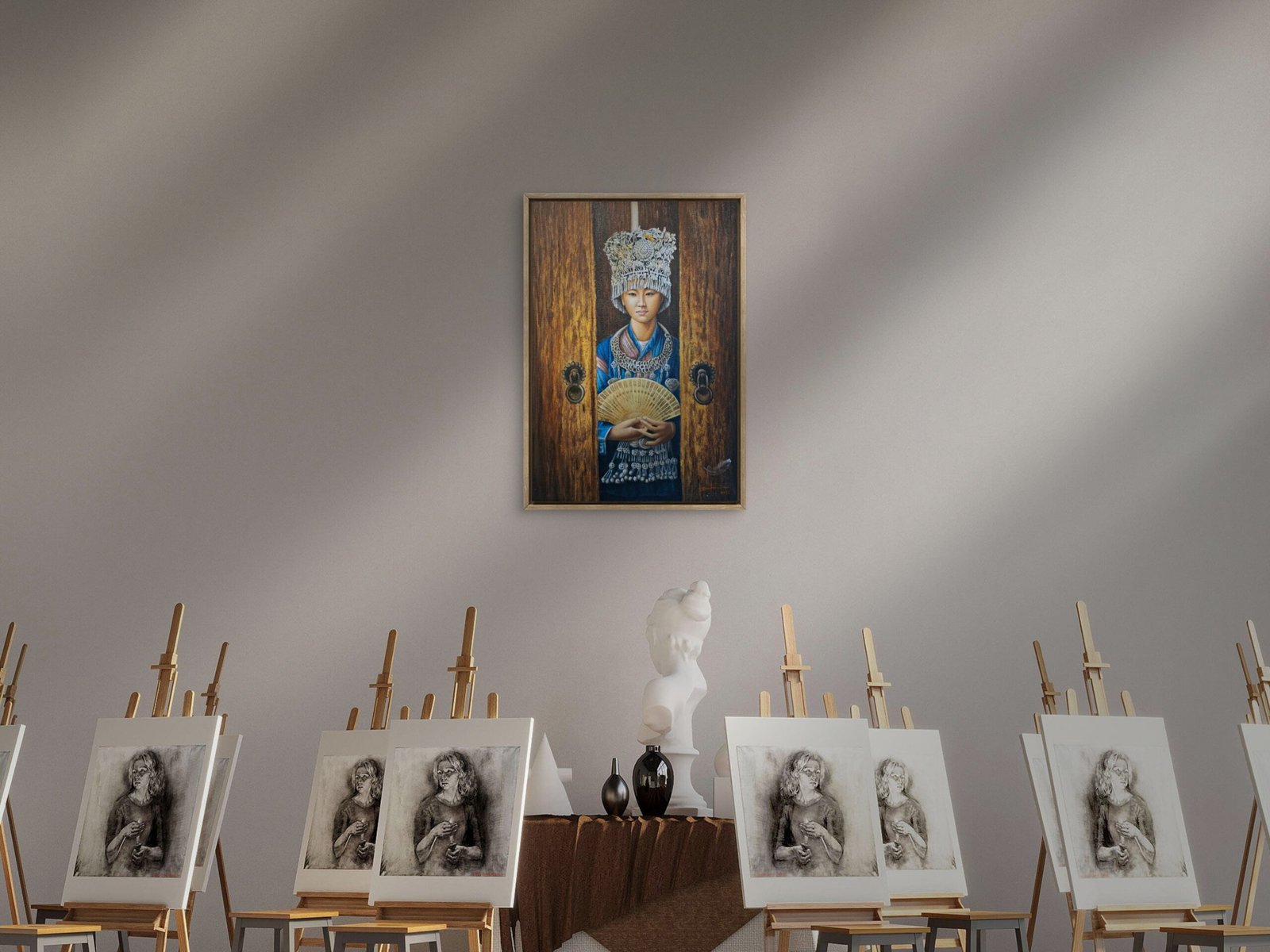 Poised between elegance and mystery, The Silent Grace portrays a young woman in traditional attire standing quietly behind carved wooden doors. Her serene gaze and intricate silver headdress reflect centuries of cultural heritage, while the delicate fan in her hands adds a sense of calm dignity. The rich textures and warm tones bring out the intimacy of tradition, beauty, and introspection — a portrait of quiet strength and timeless grace.
