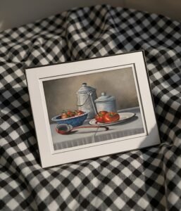 This captivating still life oil painting celebrates the simplicity and beauty of everyday objects. The composition centers around fresh tomatoes, their rich red color contrasting beautifully with the muted tones of the background. One tomato rests on a white plate, while another sits in a blue bowl, accompanied by a metallic spoon that adds a touch of elegance.