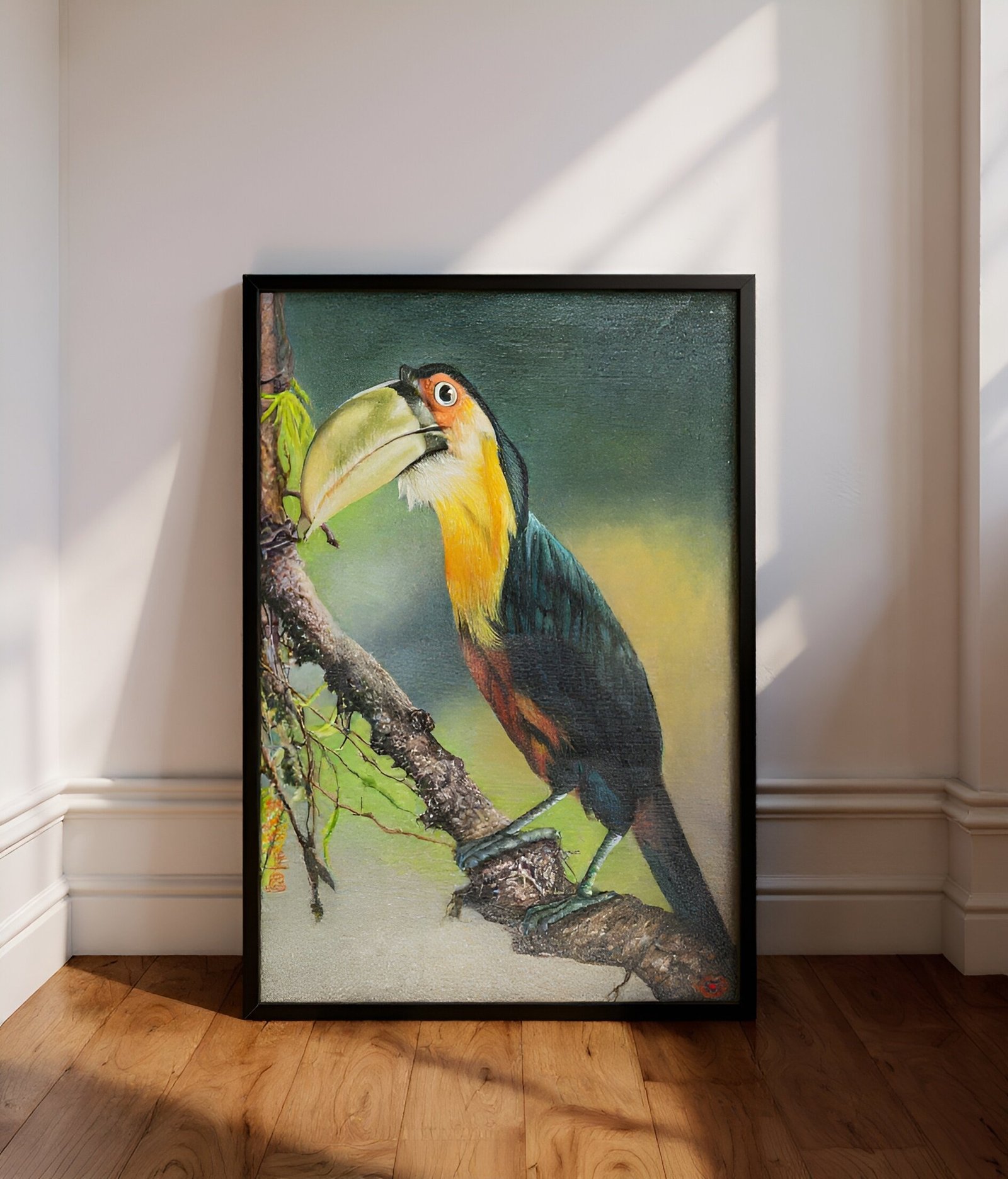 This stunning oil painting brings to life the vibrant beauty of a toucan perched gracefully on a tree branch. The bird’s striking plumage, with its bold mix of yellow, red, and green, stands out vividly against the soft, muted background of the forest. The artist captures the intricate details of the toucan’s large, curved beak and expressive eyes, highlighting its natural elegance and charm.
